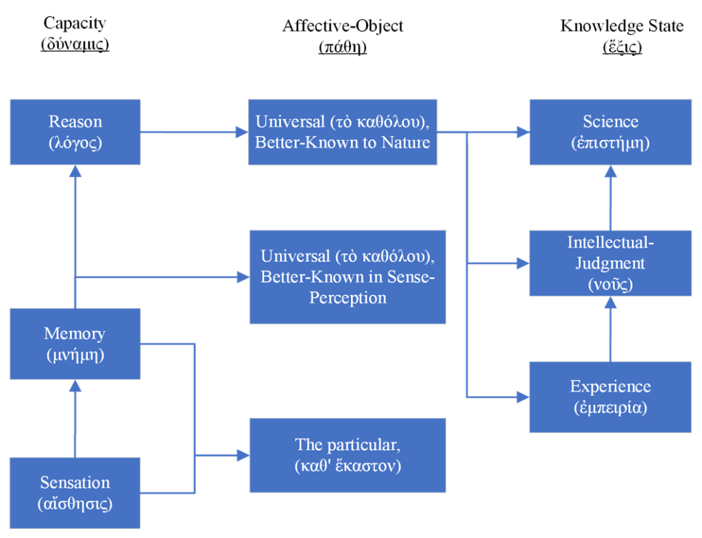 In answer to the questions he set out at the beginning of the text, Aristotle clearly expresses that the ultimate source of knowledge is the capacity of sense-perception, and the knowing state that grasps the first principles is intellectual-judgment. In order to produce these answers in accord with his own canons on knowledge of primary principles, definitions, or premises, Aristotle employs the method of division by δύναμις (dunamis) first developed by Plato. In the first stage of the genetic account, Aristotle sets down the capacities adequate for explaining how knowledge of first principles is obtained: sense-perception, memory, and reason. However, and as we saw Aristotle explicitly indicate before moving into the second stage, these capacities and the knowledge states which they produce are initially stated without distinction(οὐ σαφῶς) in stage 1.[118] The reason for this, is that he has not yet divided them in terms of their proper objects. This, precisely, is what he accomplishes in the second stage of his approach, where, through analysis, he correlates the capacities and the states they produce with their proper objects, namely, the particular and the universal. The following schematic diagram relates each of the capacities set down to their objects along with the knowledge states that they produce: